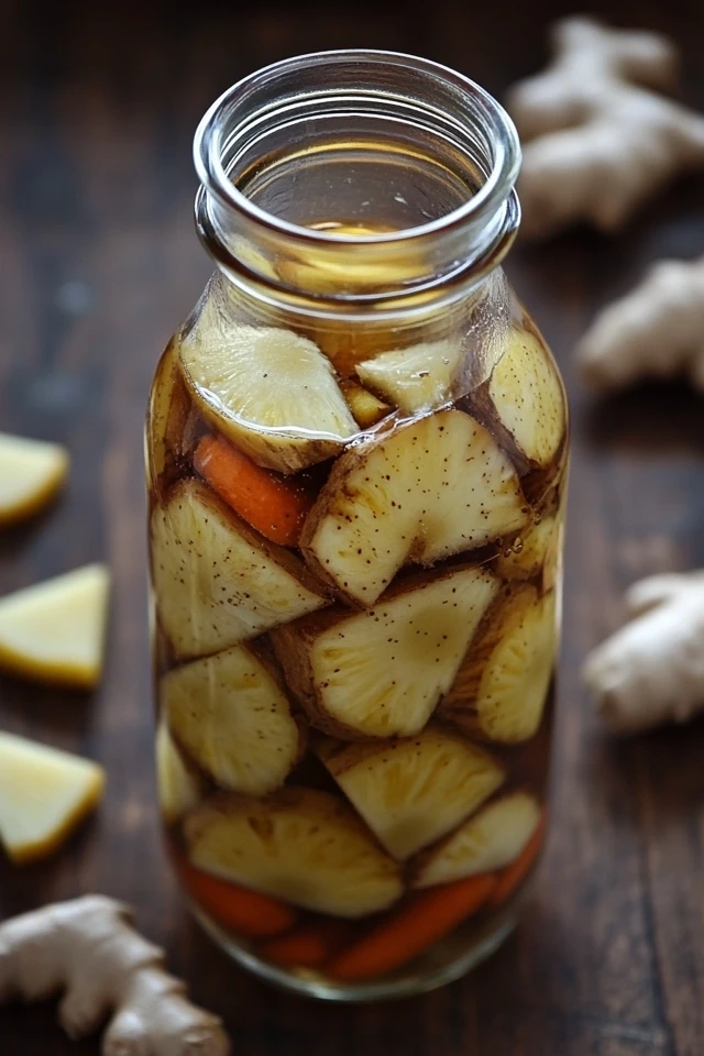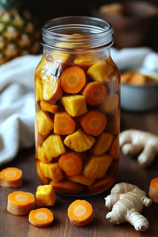 - Combine Ingredients: In a large pitcher, layer the carrot slices, pineapple chunks, and ginger slices.