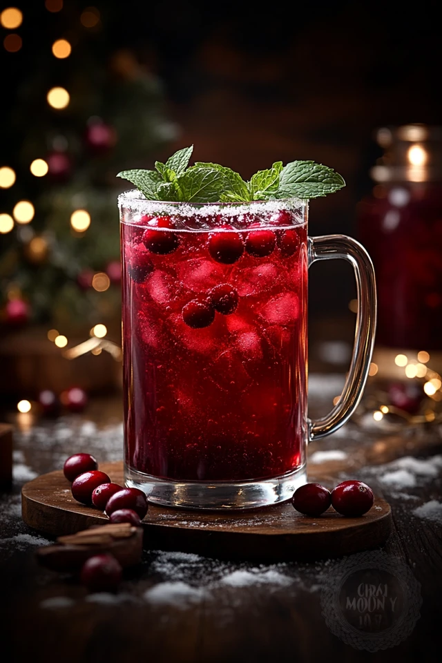 Mint leaves provide the signature mojito freshness, cutting through the tartness of the cranberry juice and adding a cool, herbal aroma. The muddled mint also enhances the visual appeal, with flecks of green floating in the punch.