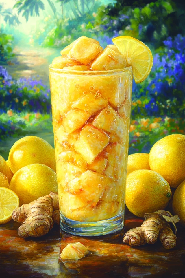 Fill glasses with ice cubes and pour the juice over the ice. Garnish with a slice of ginger, a wedge of lemon, or a sprig of mint for a decorative touch. Serve immediately and enjoy the sweet, spicy, and zesty flavors!