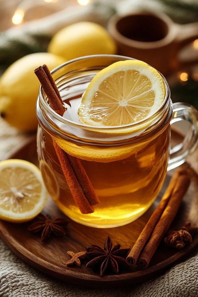 - Serve and Garnish – Pour into mugs or glasses, and garnish with lemon slices and a cinnamon stick.