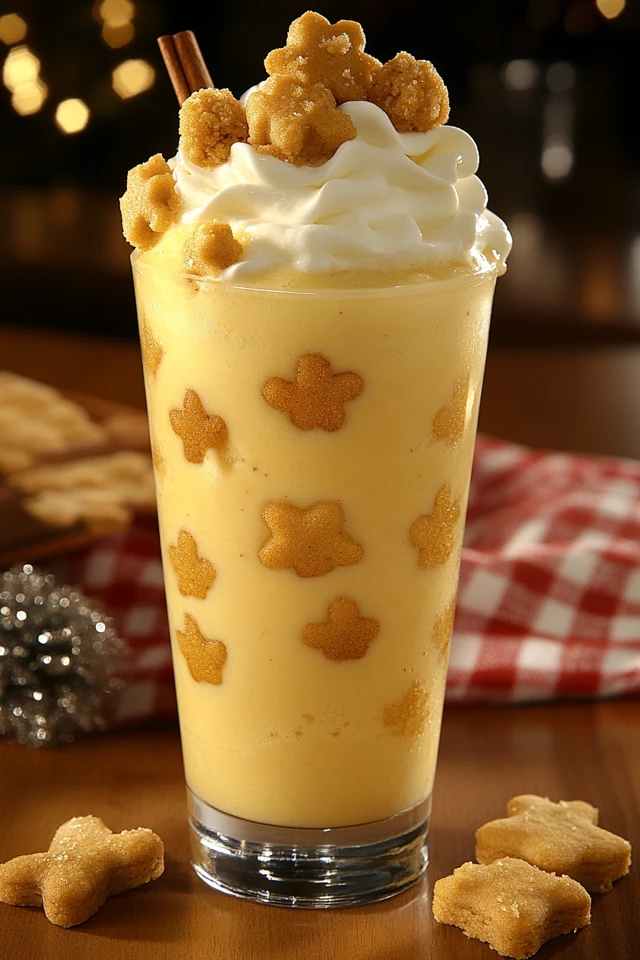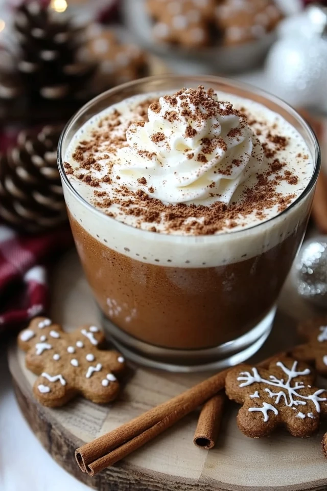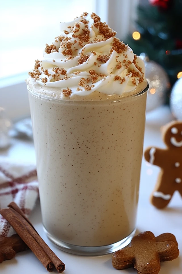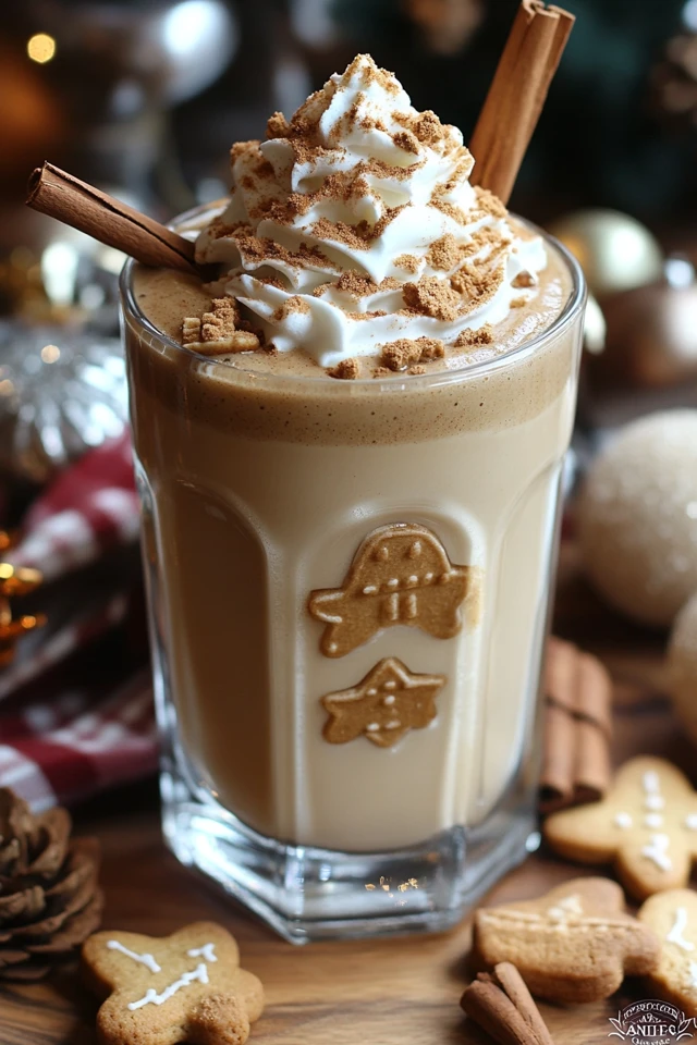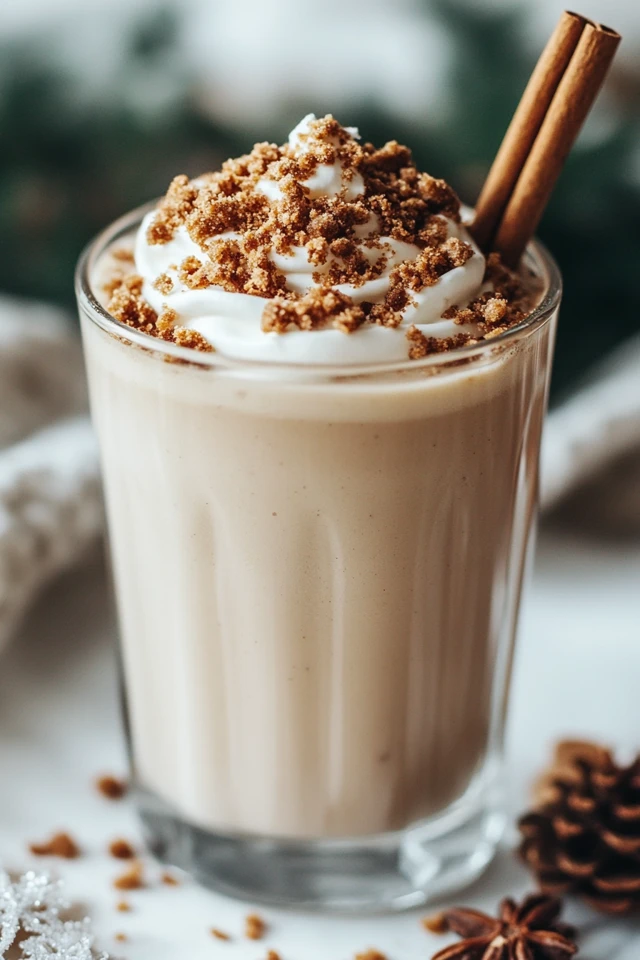 - Pour into a tall glass and top with whipped cream, a sprinkle of cinnamon, and crushed gingerbread cookies.