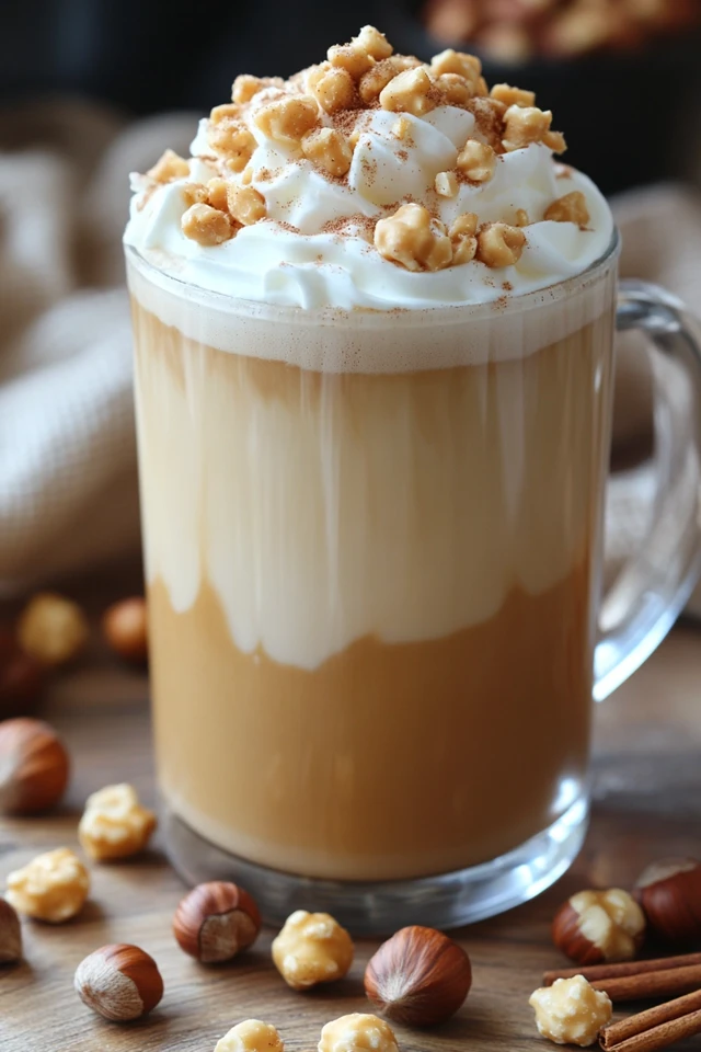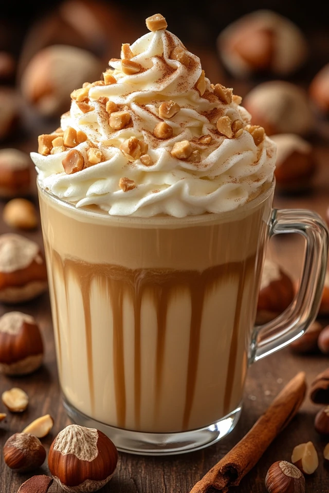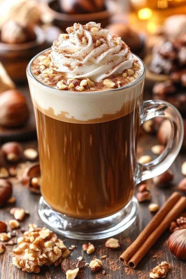 - Serve and Garnish: Top the latte with whipped cream and garnish with crushed hazelnuts, a sprinkle of cinnamon, or a drizzle of hazelnut syrup for a decorative touch. Serve immediately and enjoy!