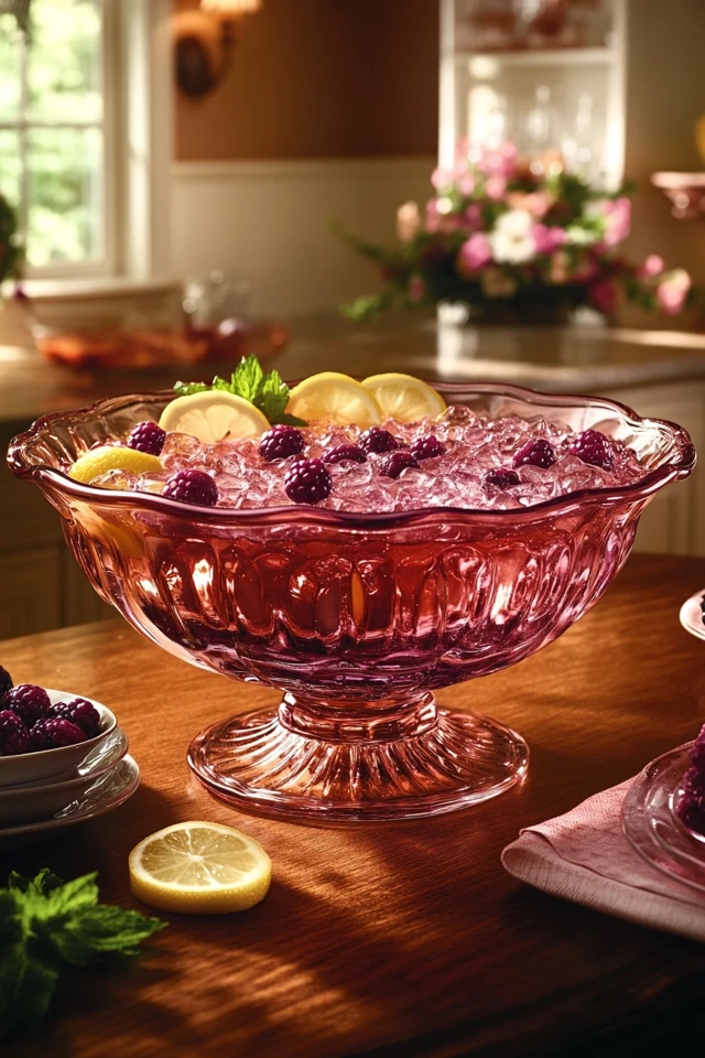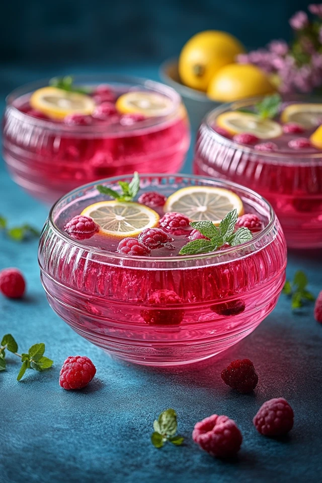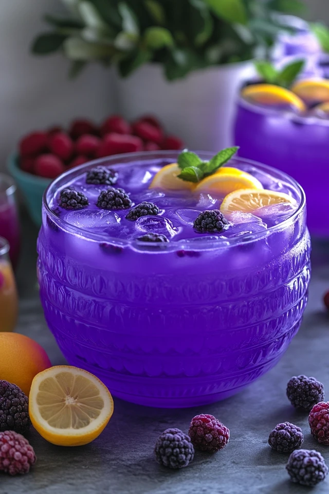 - Garnish and Serve: Serve the punch in glasses over ice, and garnish with fresh mint leaves, lemon slices, and extra berries.