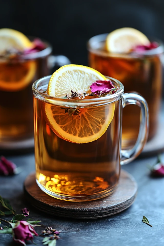 Garnish with a slice of lemon and a sprinkle of dried rose petals for a decorative touch. Serve hot, or let cool and pour over ice for a chilled version.