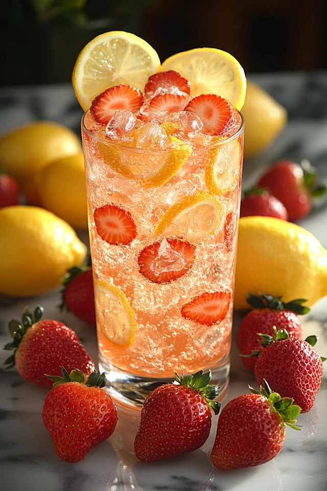 Now imagine serving this drink at a brunch or picnic. A clear glass pitcher filled with vibrant yellow lemon slices and ruby-red strawberries is not just a drink—it’s a conversation starter. Guests can’t resist pouring themselves a glass and raving about how light and flavorful it is.