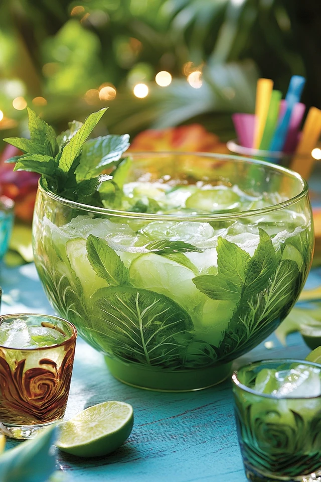 - Fresh Mint: No mojito is complete without mint, and in this party punch, mint is the key to creating that signature cooling effect. Fresh mint adds a burst of herbal flavor that’s not only aromatic but also incredibly refreshing. The mint infuses the drink with its unique flavor, making each sip crisp and invigorating. It’s the perfect complement to the citrusy lime and smooth rum.