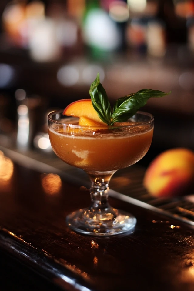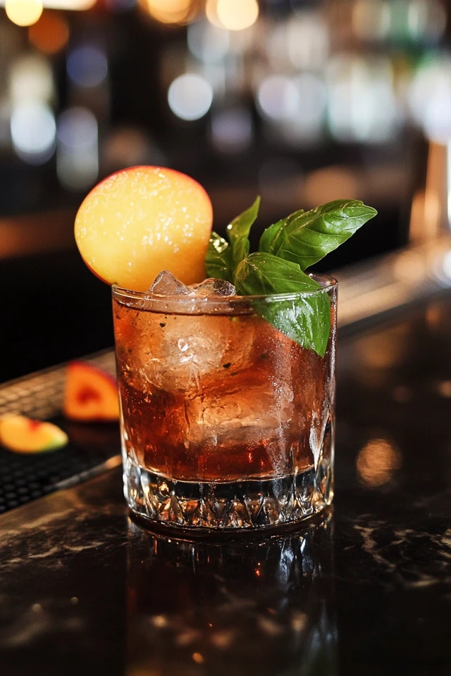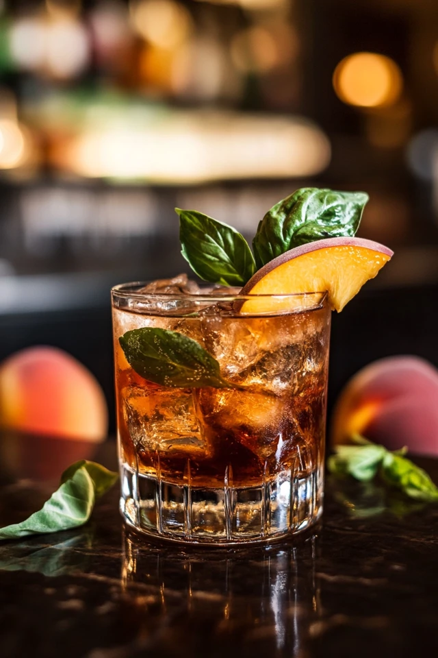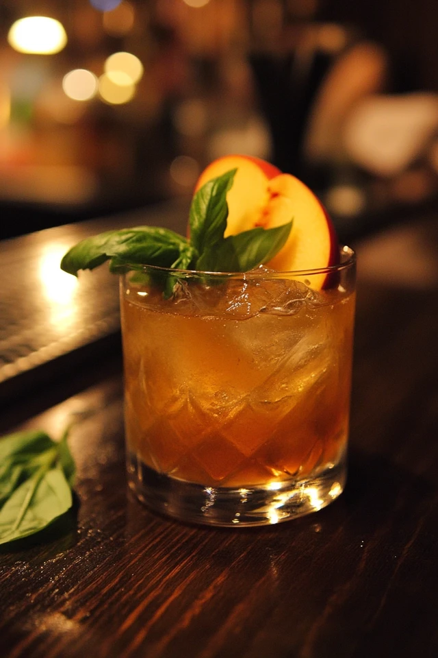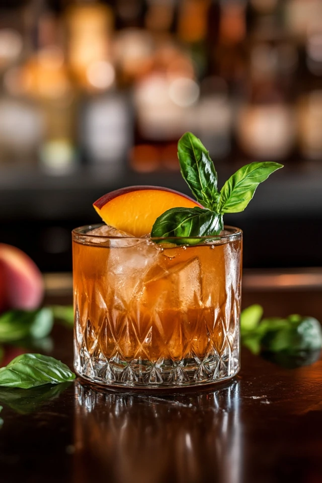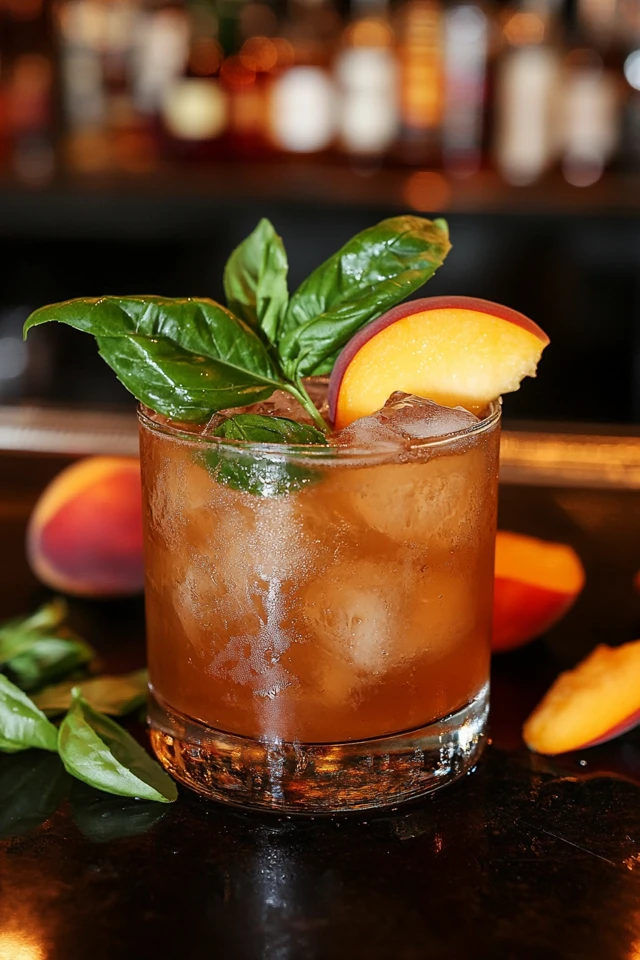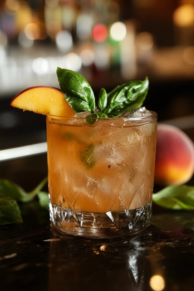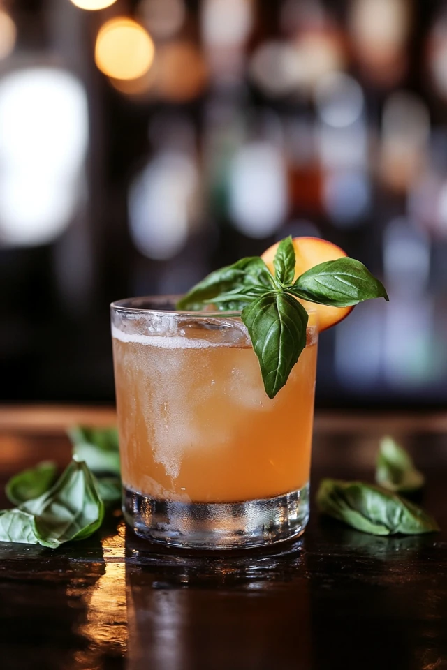 Basil’s fresh, slightly peppery aroma adds an unexpected twist to the drink. It enhances the sweetness of the peaches while cutting through the richness of the bourbon, creating a balanced and refreshing flavor profile.