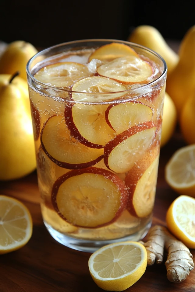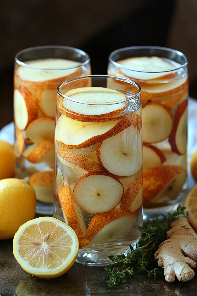 Now imagine serving this drink chilled at a summer garden party. A glass pitcher filled with golden pear slices, bright lemon rounds, and thin strips of ginger is not just a refreshing drink—it’s a centerpiece that guests can’t stop talking about.
