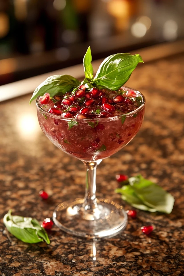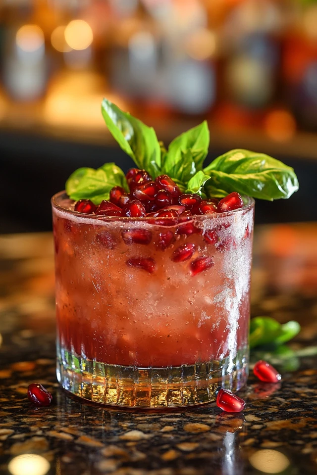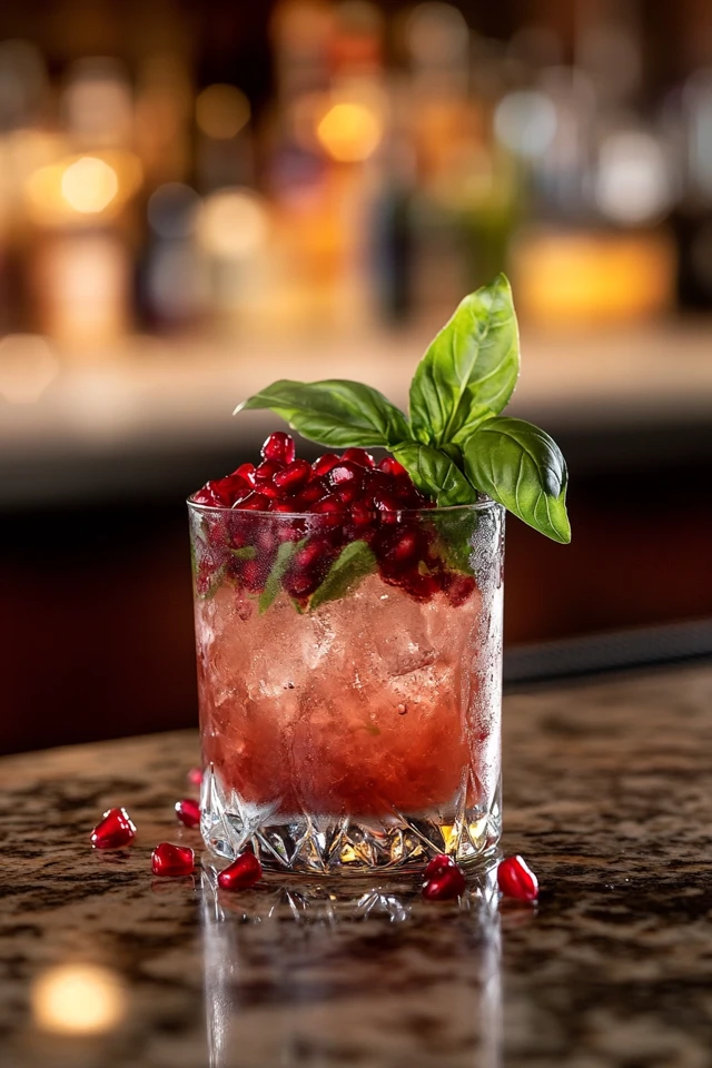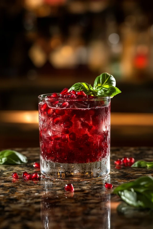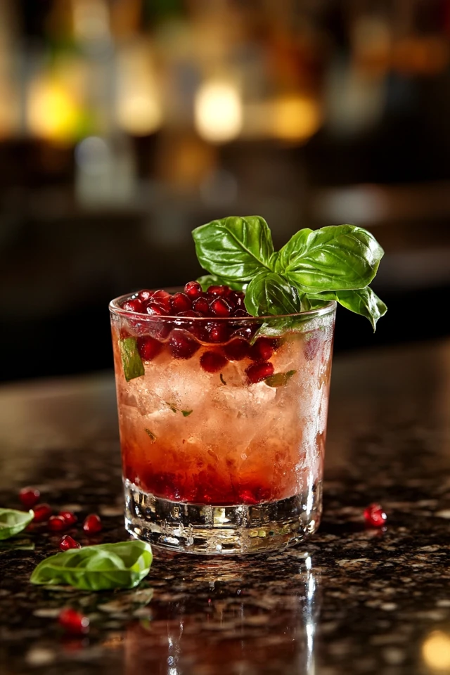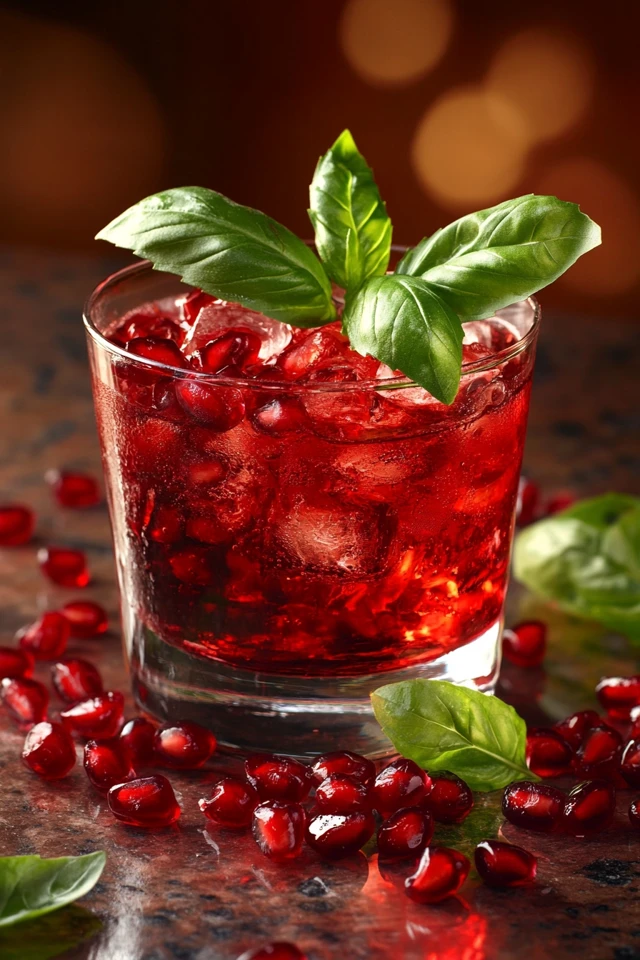 - Fresh Basil: Basil’s earthy, slightly peppery notes add depth and complexity to the cocktail. When muddled, basil releases its fragrant oils, creating a refreshing herbal backdrop that perfectly balances the sweetness of the pomegranate.