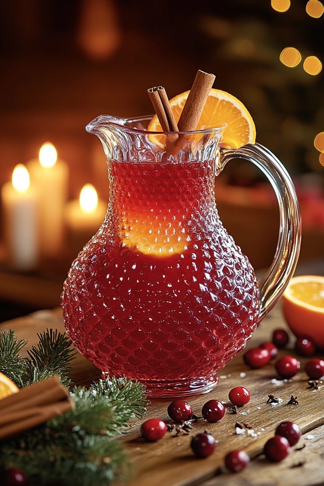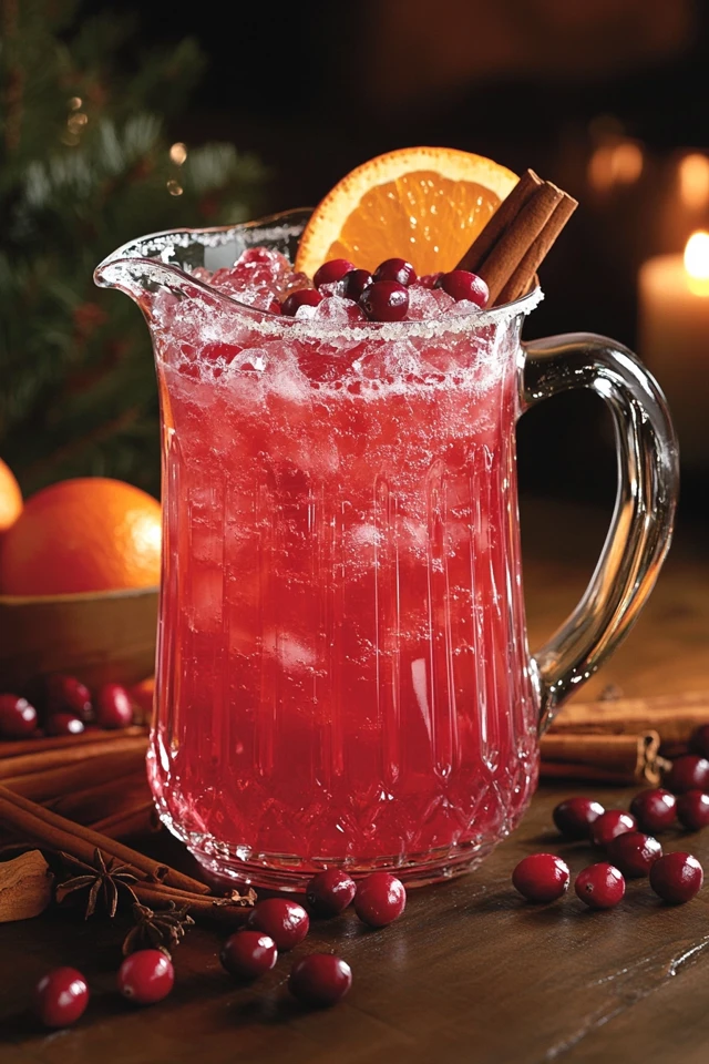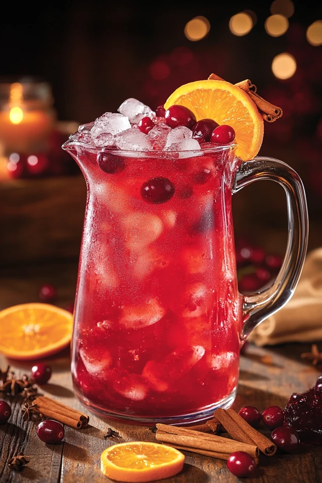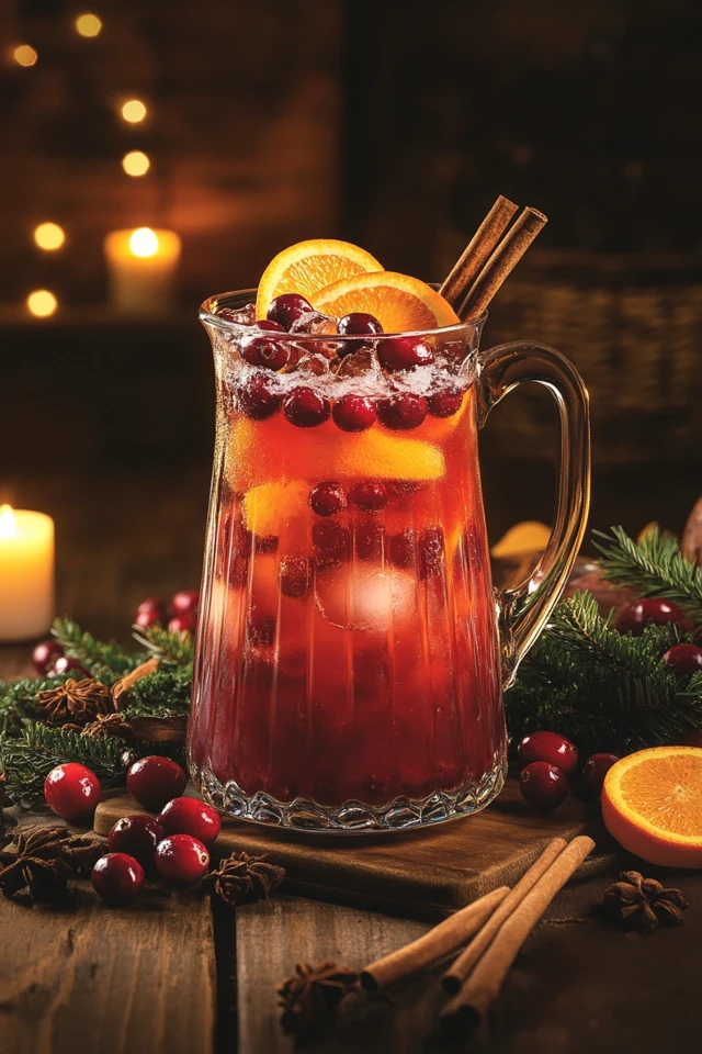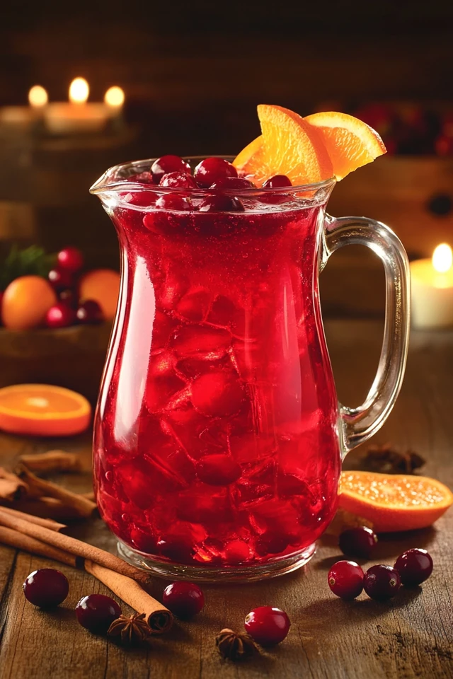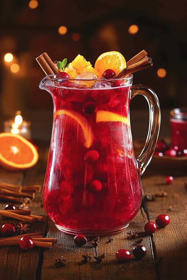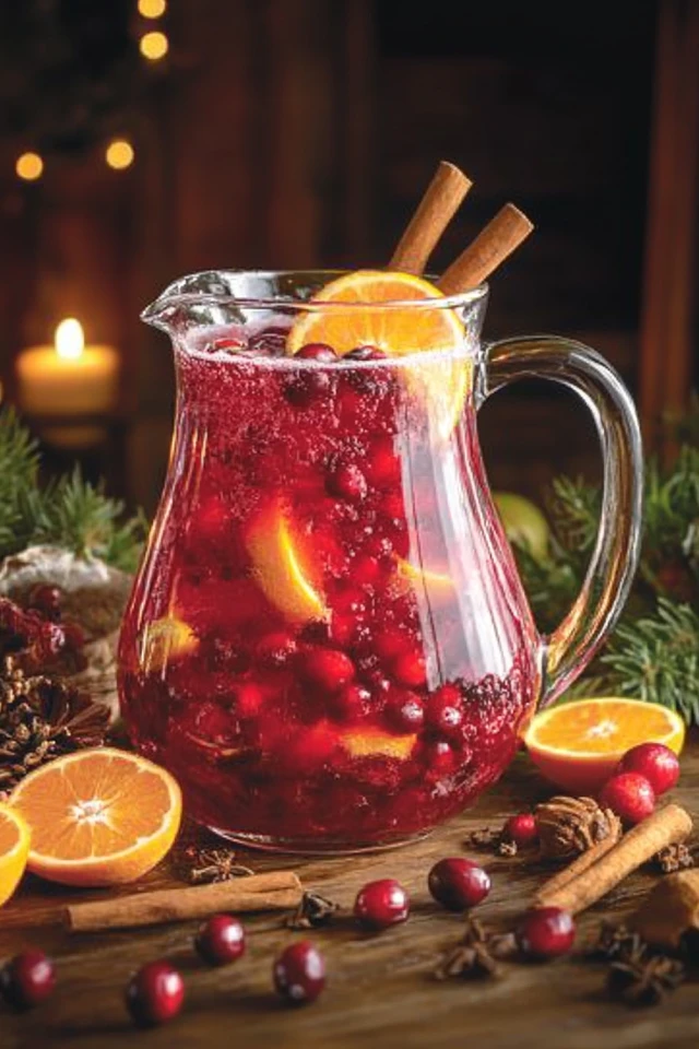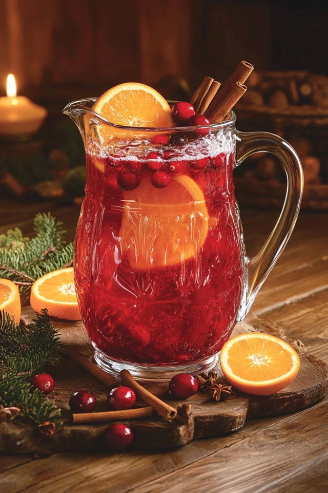 - Garnish: fresh cranberries, orange slices, cinnamon sticks, or rosemary sprigs