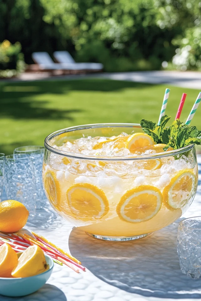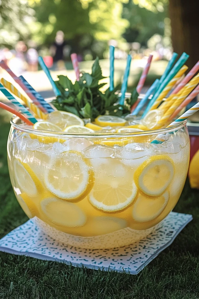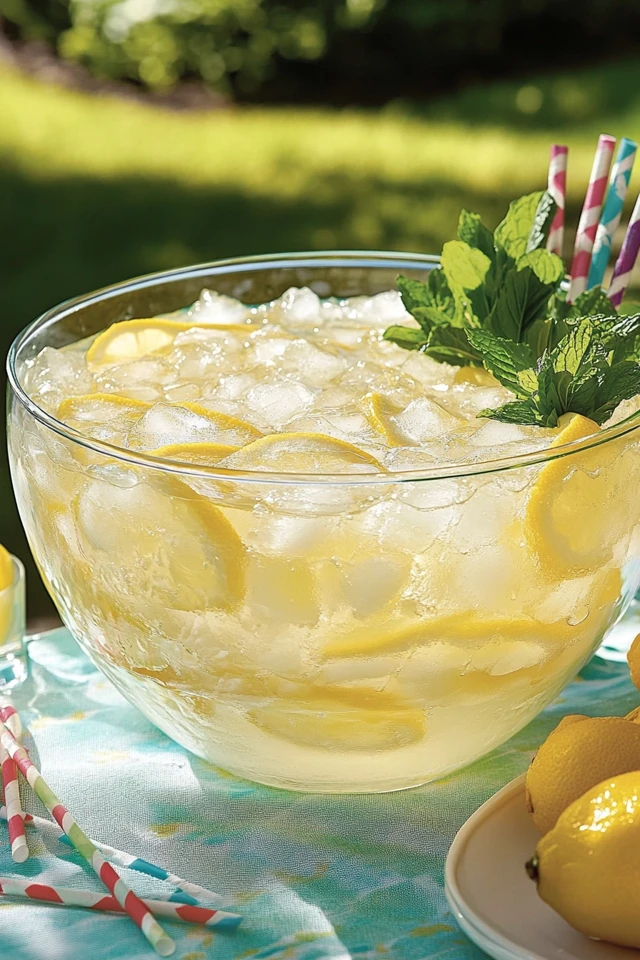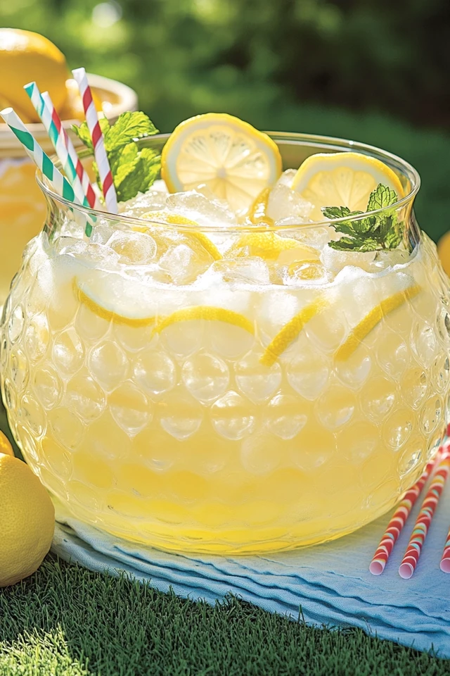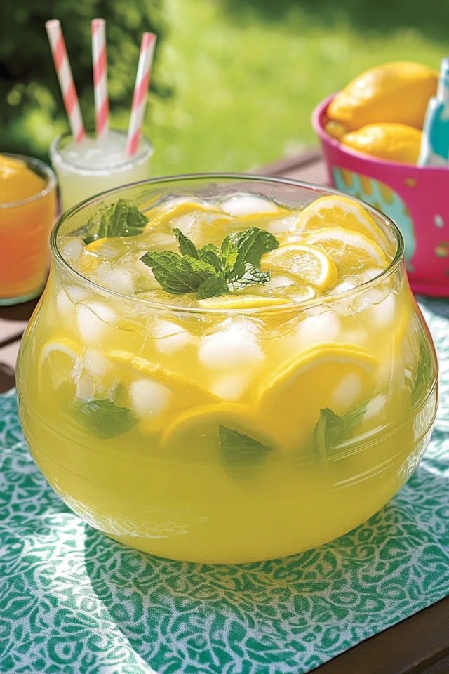 - Serve and Garnish: When ready to serve, pour the punch into glasses filled with ice and garnish with fresh lemon slices, mint leaves, and berries for a festive touch. Serve with fun straws or cocktail sticks for extra flair.
