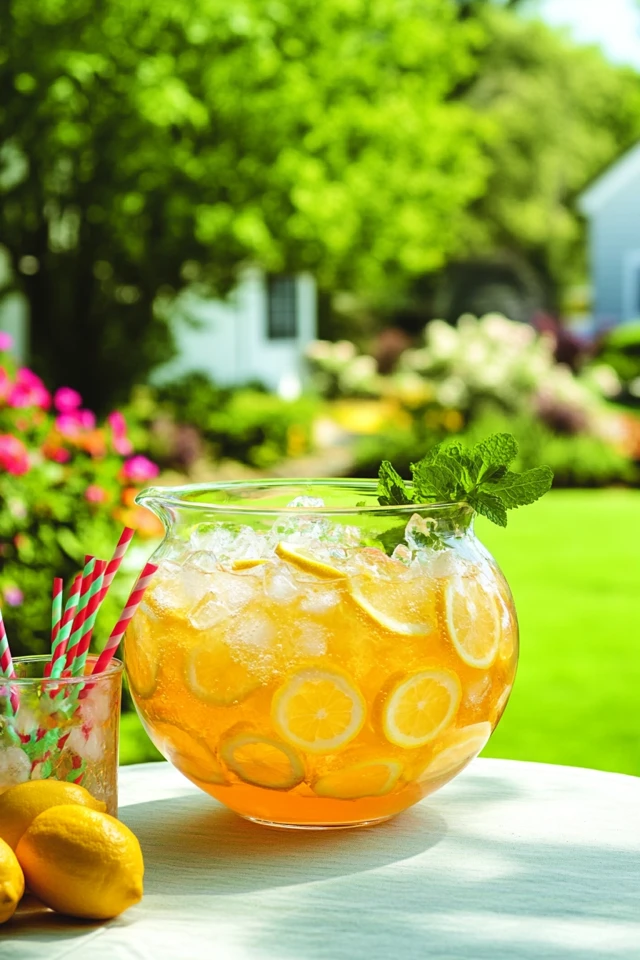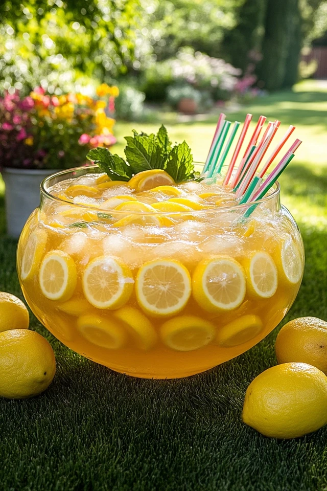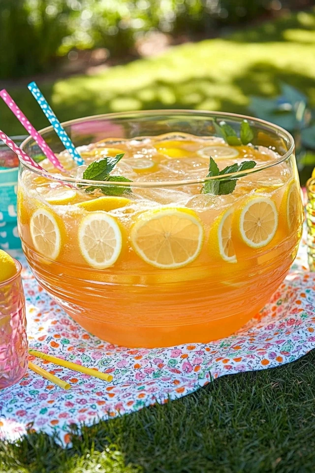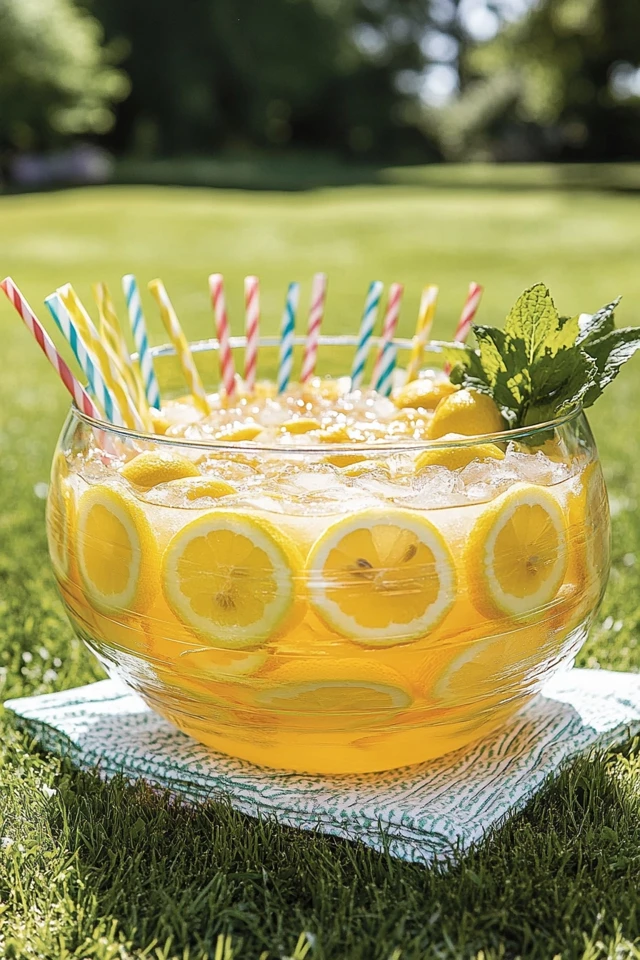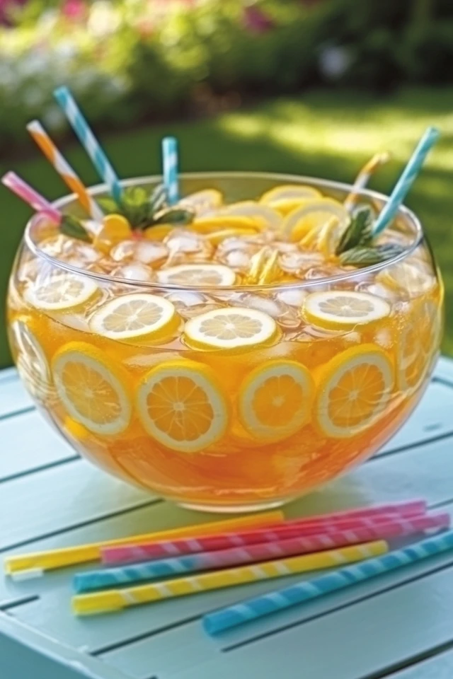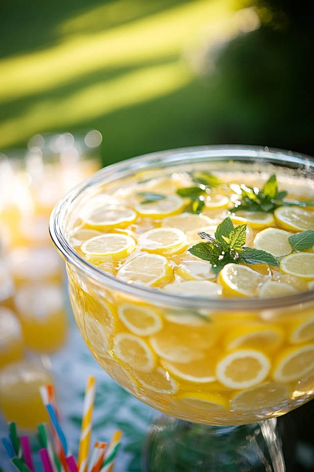 - Serve and Garnish: When ready to serve, pour the punch into glasses filled with ice and garnish with fresh lemon slices, mint leaves, and berries for a festive touch. Serve with fun straws or cocktail sticks for extra flair.