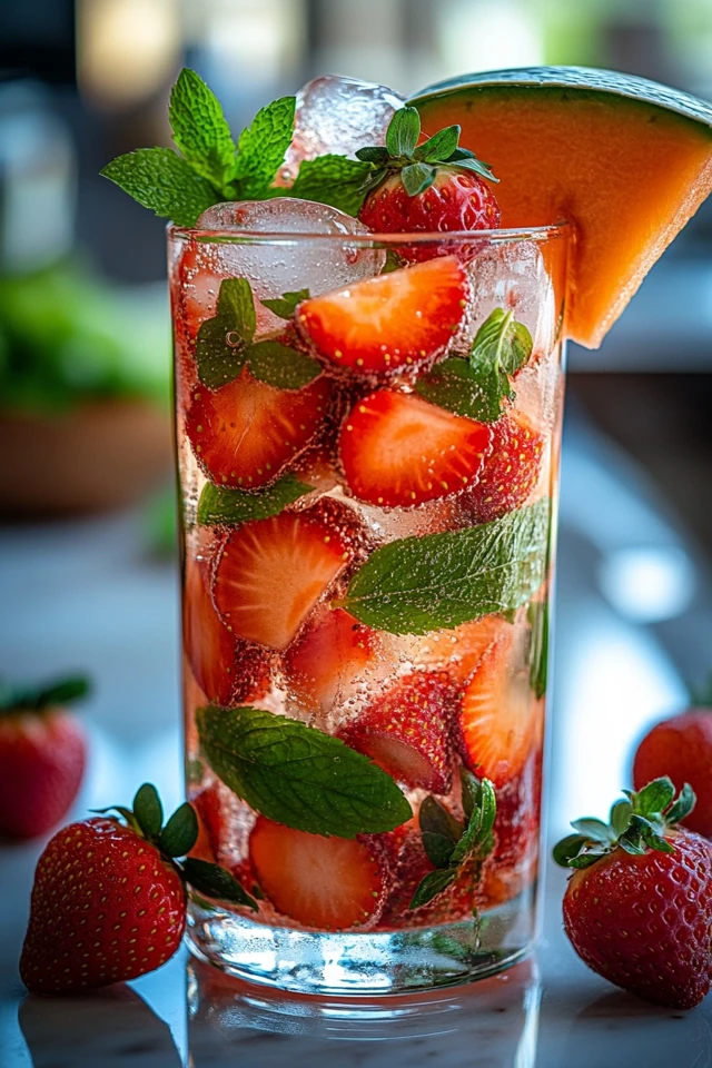 Now imagine serving this drink at a brunch or picnic. A clear glass pitcher filled with bright red strawberries and golden-orange cantaloupe slices is not just a refreshing drink—it’s also a stunning centerpiece. Guests pour themselves a glass and instantly fall in love with the light, fruity flavor.