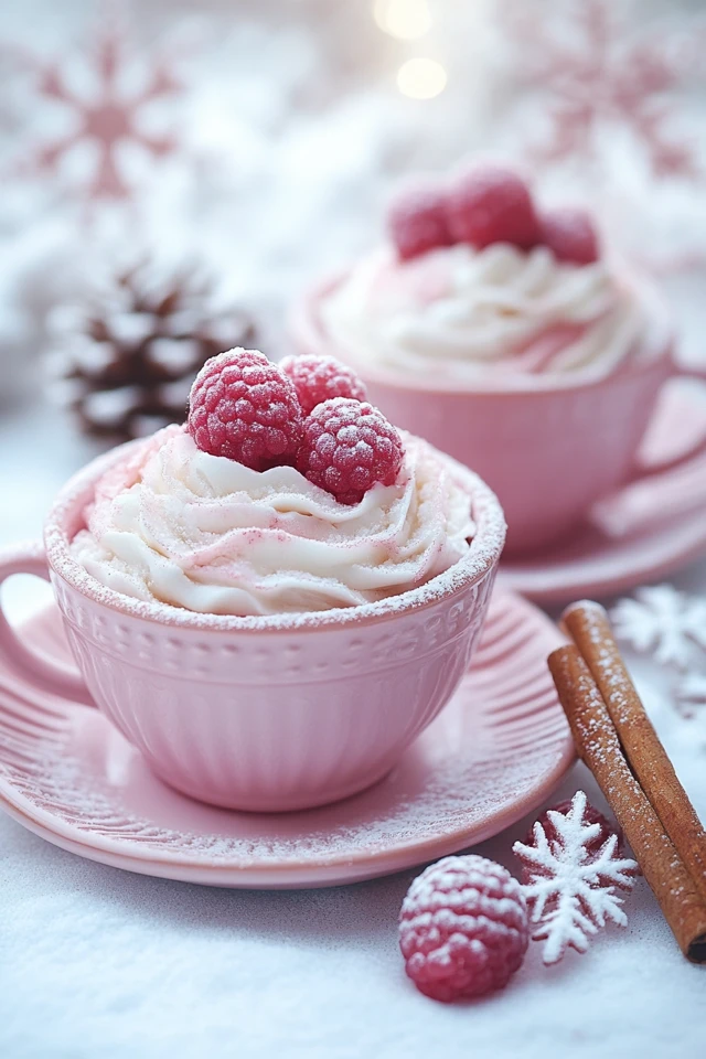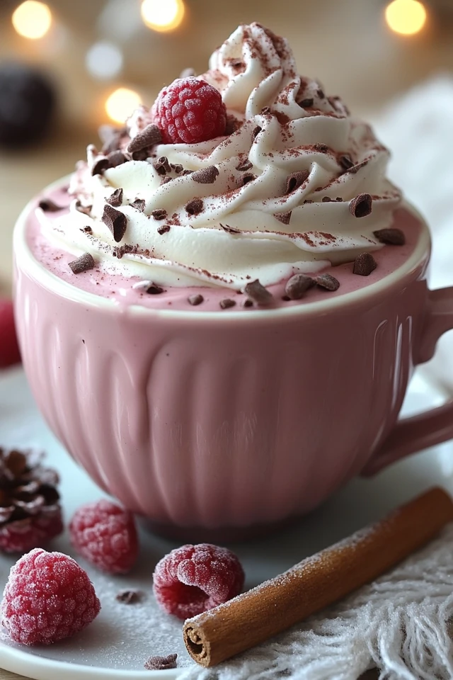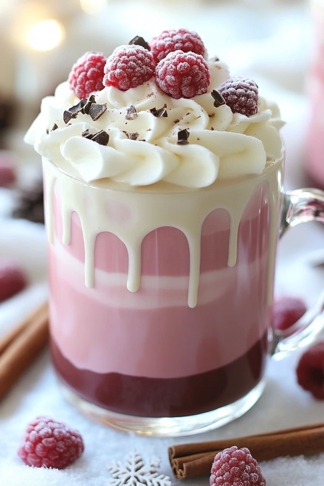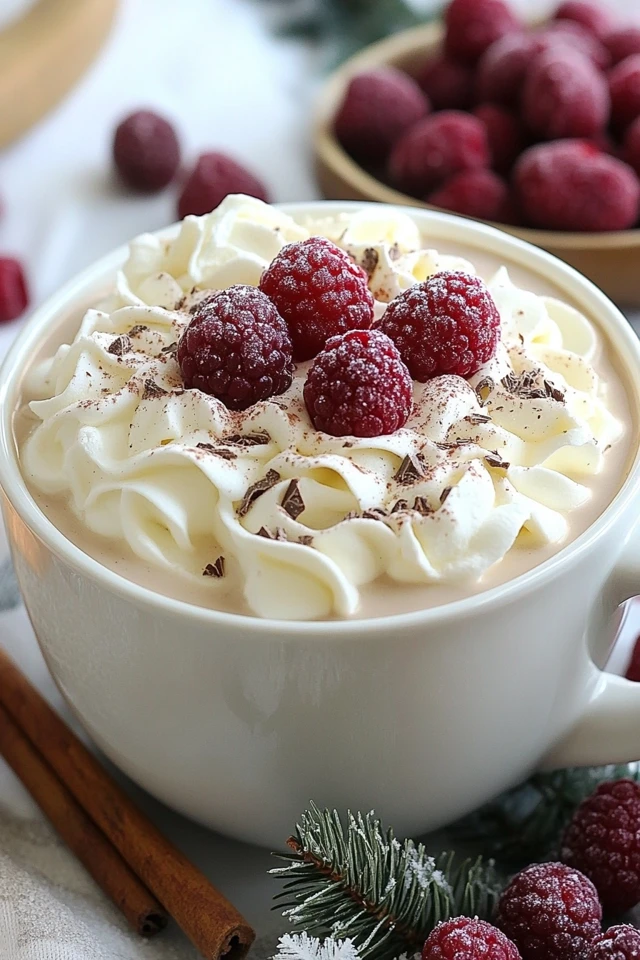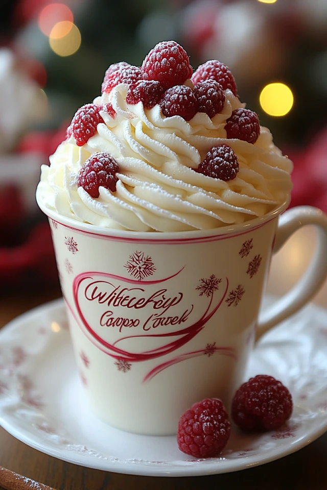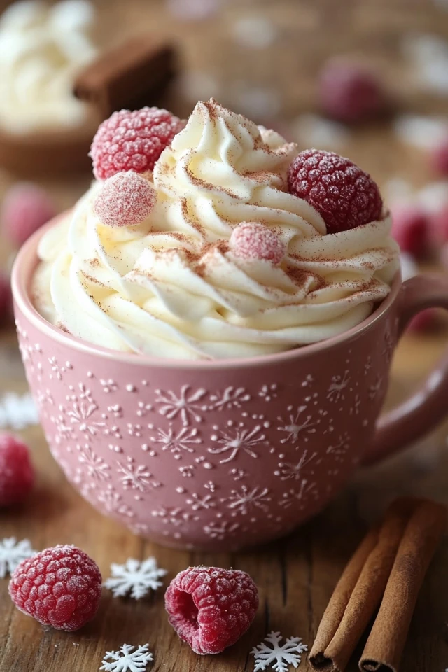 - Top and Garnish: Add a dollop of whipped cream on top, and garnish with fresh raspberries or white chocolate shavings for a festive touch.